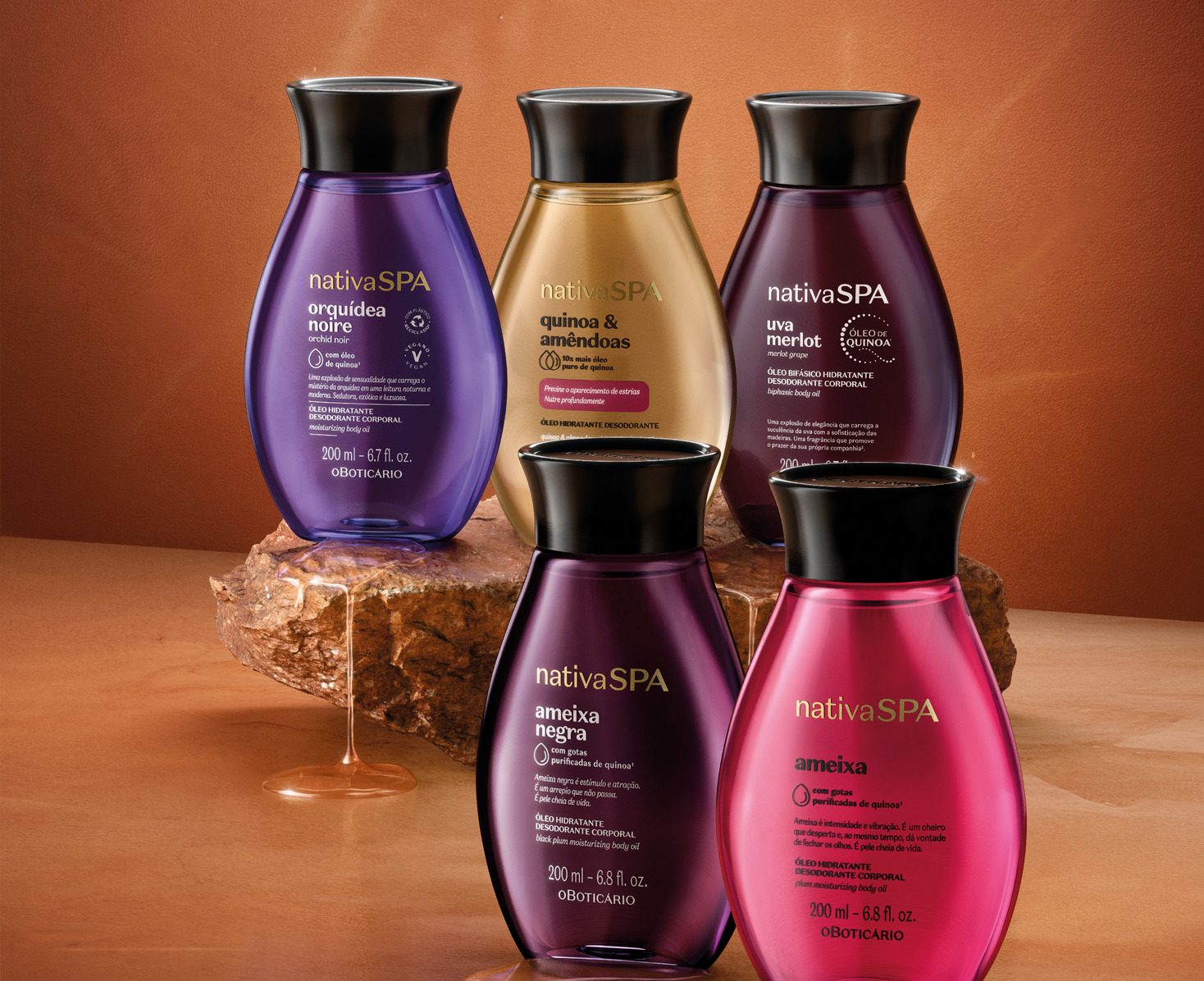 Além disso, pela primeira vez, o Boticário traz a possibilidade do uso de refis² dentro da categoria de óleos corporais, sendo um recurso já disponibilizado nas linhas fixas de Nativa SPA, que são: Ameixa; Ameixa Negra; e Quinoa & Amêndoas.