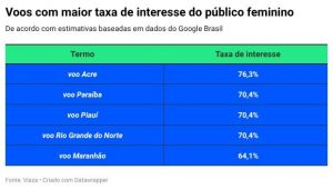 Levantamento da Viaza mostra que 70,4% das buscas por “voo Paraíba” são feitas por mulheres; estado só perde para o Acre no interesse feminino