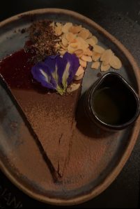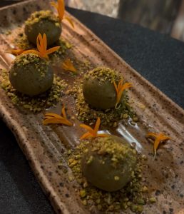 Nas sobremesas, o destaque vai para a Tarte au Chocolat, elaborada com chocolate Callebaut, geleia de frutas vermelhas, farofa crocante de chocolate com amêndoas e calda de laranja marroquina, e o brigadeiro de pistache macio e crocante que me remeteu ao lado mais afetivo de infância. O resultado é uma sobremesa marcada por diferentes texturas e camadas, pensada para proporcionar uma experiência mais completa ao final da refeição.