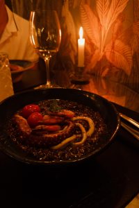 Entre os destaques que experiementei foi o Arroz di Mare apresenta uma construção rica, com arroz negro preparado em fundo de frutos do mar, servido com lula, tentáculos de polvo e camarão, todos grelhados na manteiga, resultando em um prato intenso e bem estruturado.